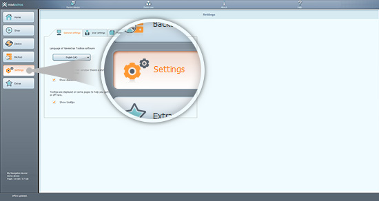 If you click “Settings”, you automatically land on the “General settings” tab, where you can set the language you wish to use Naviextras Toolbox in. (Changing the language will result in Naviextras Toolbox restarting to apply the changes.)